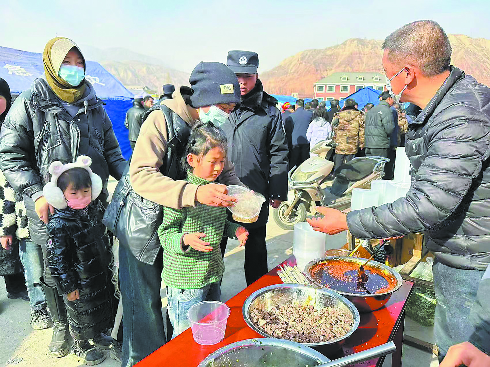 12月19日,在甘肃临夏州积石山县大河家镇大河村安置点,受灾群众排队取餐。新华社记者 张文静摄