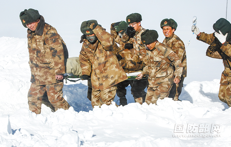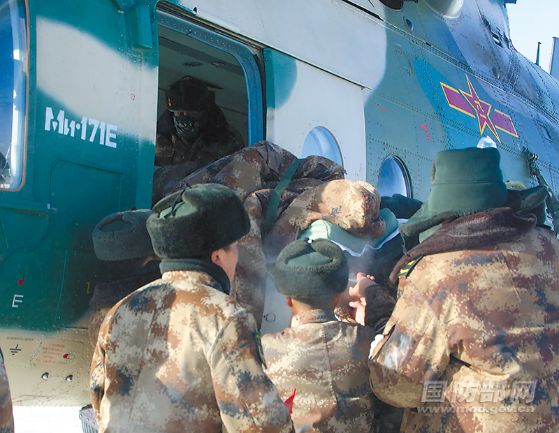 官兵用担架将患病战士送上直升机。