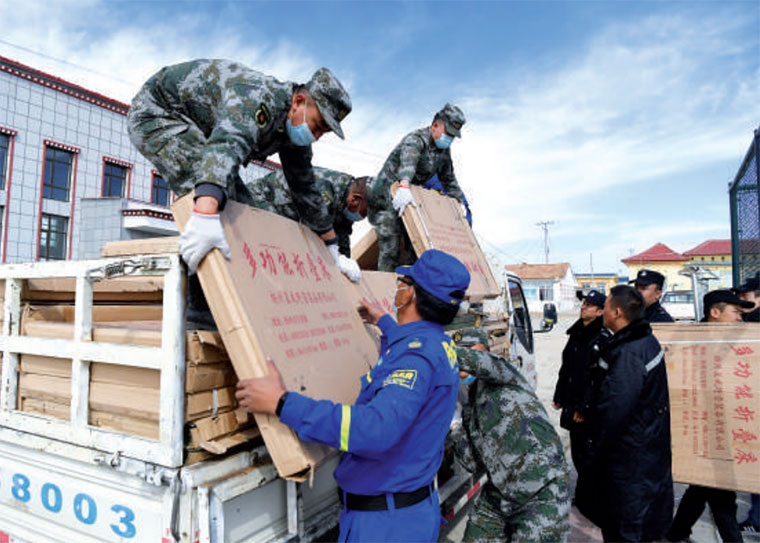 在玛多县黄河乡,学生住进帐篷后,军分区官兵、民兵丝毫不懈怠,每晚都要挨个帐篷去查看孩子们的就寝情况。巡查中,军分区领导了解到,有的帐篷里有些潮湿,不利于孩子的身体健康。于是,军分区立即行动起来,为学校捐赠150张折叠行军床,并为每名学生赠送一套书包文具。行军床铺好后,学前班的孩子们高兴地在床上蹦蹦跳跳。