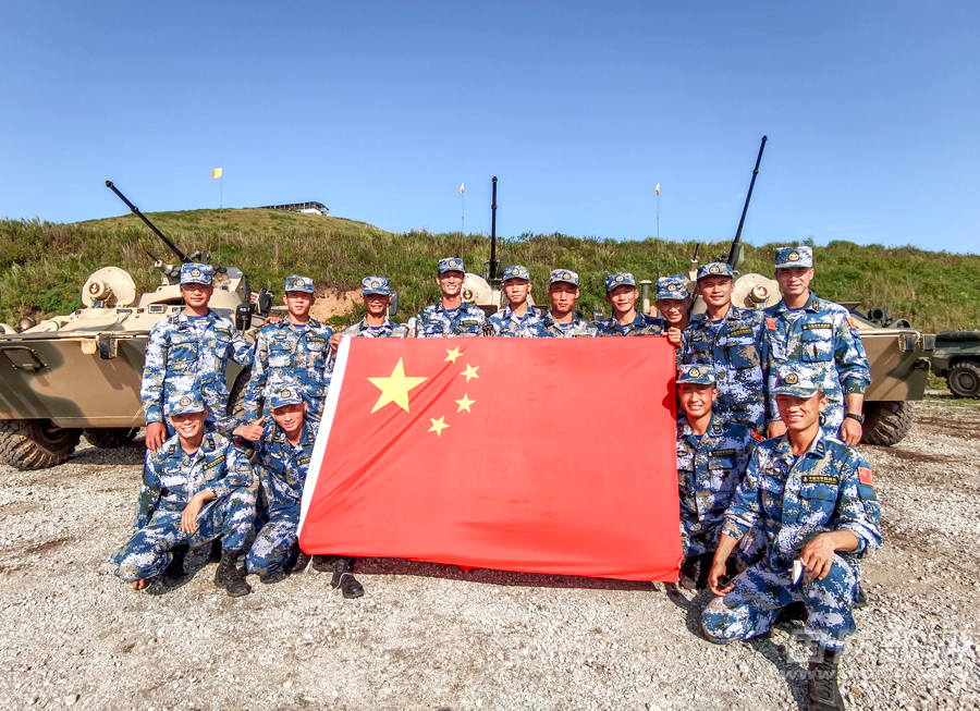中国参赛队赛前在装甲车前展开国旗。