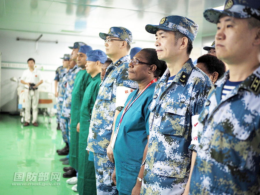 7月17日,在中国海军和平方舟医院船,中国和巴布亚新几内亚医护人员整队待命。江山 摄
