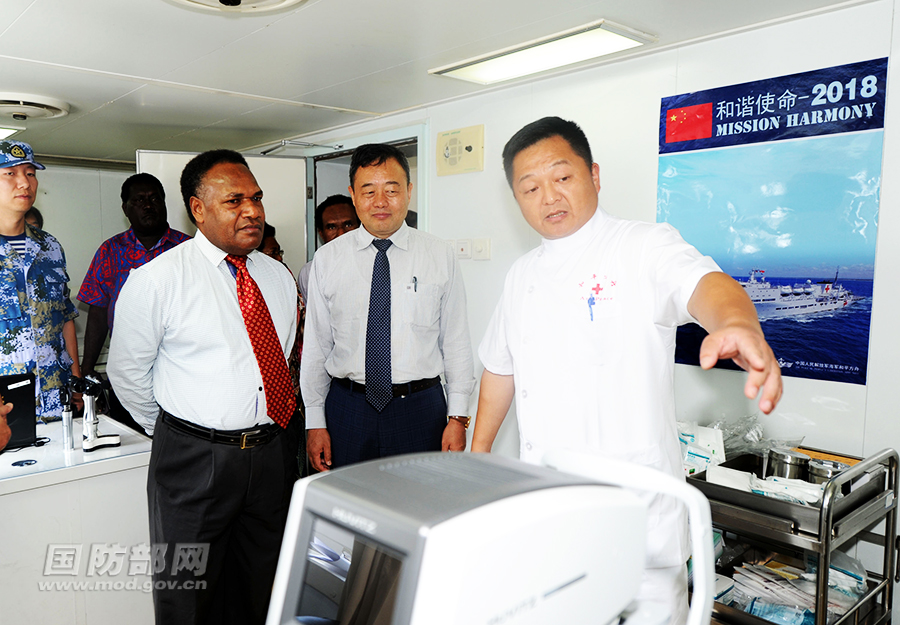 7月17日,在中国海军和平方舟医院船,巴布亚新几内亚卫生部秘书长(左一)参观医院船医疗设备。江山 摄