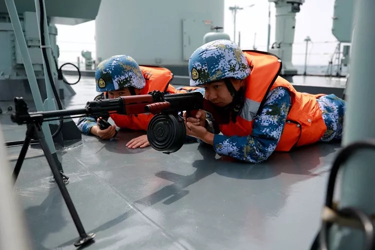 ▲在武力营救被海盗劫持船舶演练中,湘潭舰官兵严阵以待。张千 摄