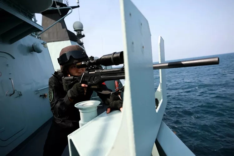▲在武力营救被海盗劫持船舶演练中,中国海军特战队员严阵以待。张千 摄