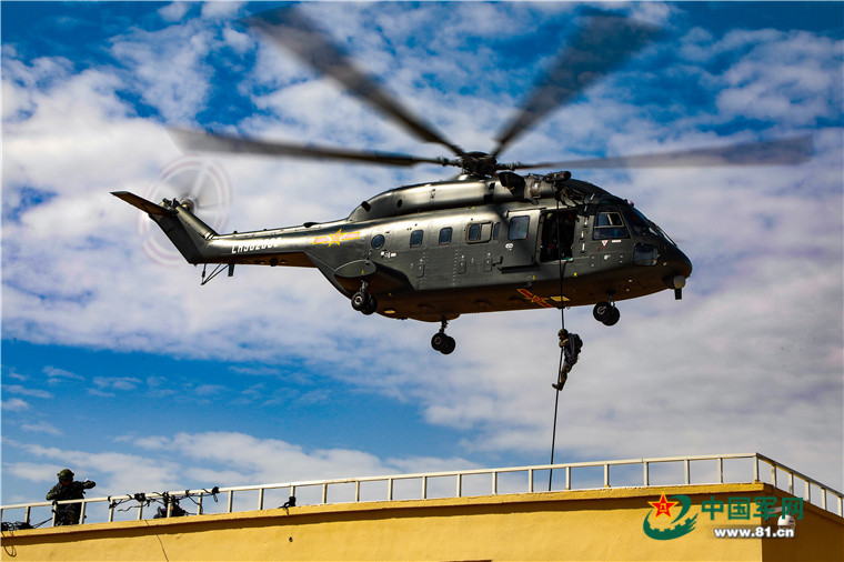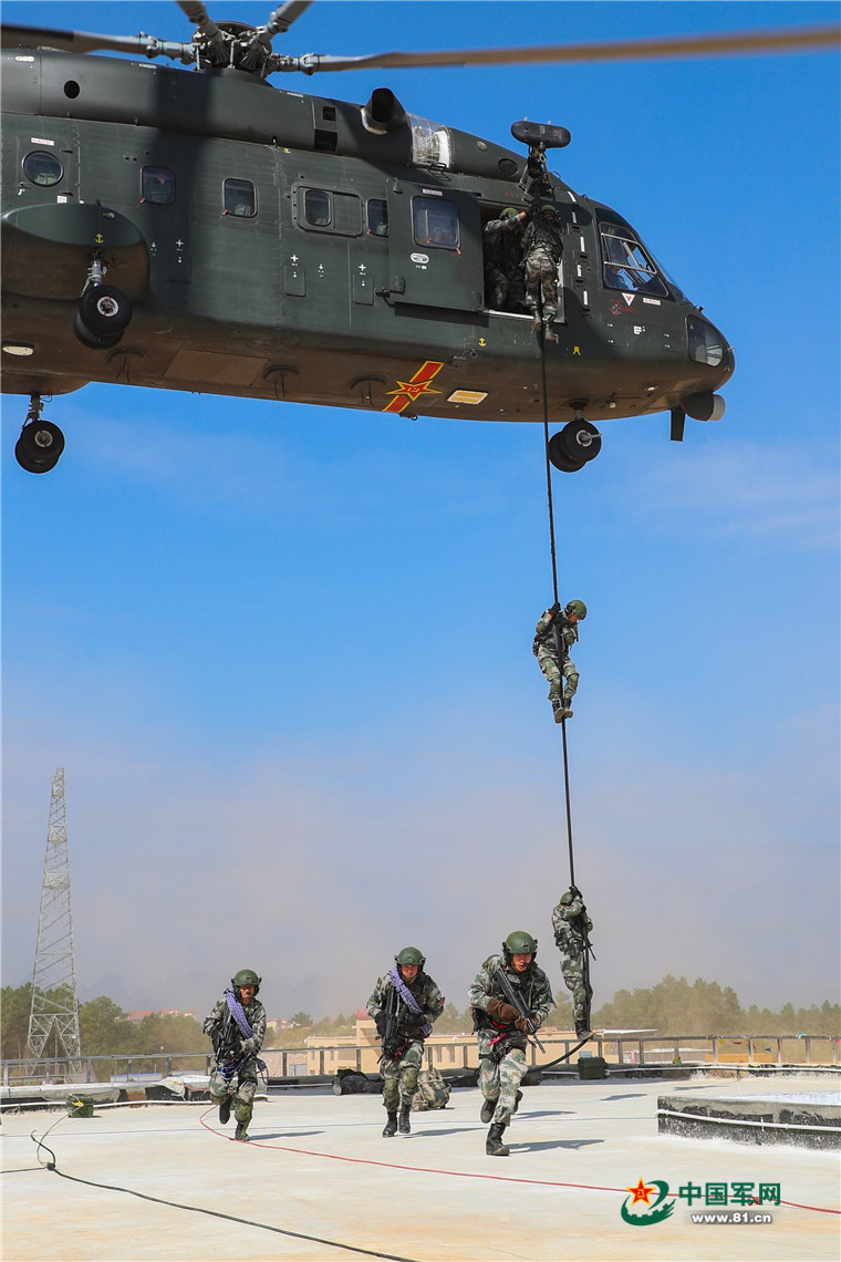一架直升机从远方朦胧的山脉盘旋而来,悬停在被恐怖分子控制的“剧院”上空,一名突击队员快速绳降在“剧院”楼顶,进入狙击警戒位置,之后几名突击队员依次快速绳降,悄无声息地进入“剧院”……这是空中突击队在进行直升机机降训练,模拟城市反恐中的立体营救和打击任务。