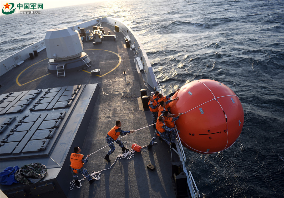 当地时间1月10日,“海洋卫士-2020”中巴海上联合演习在北阿拉伯海域举行。图为运城舰官兵布放浮体靶标。记者 穆瑞林 摄