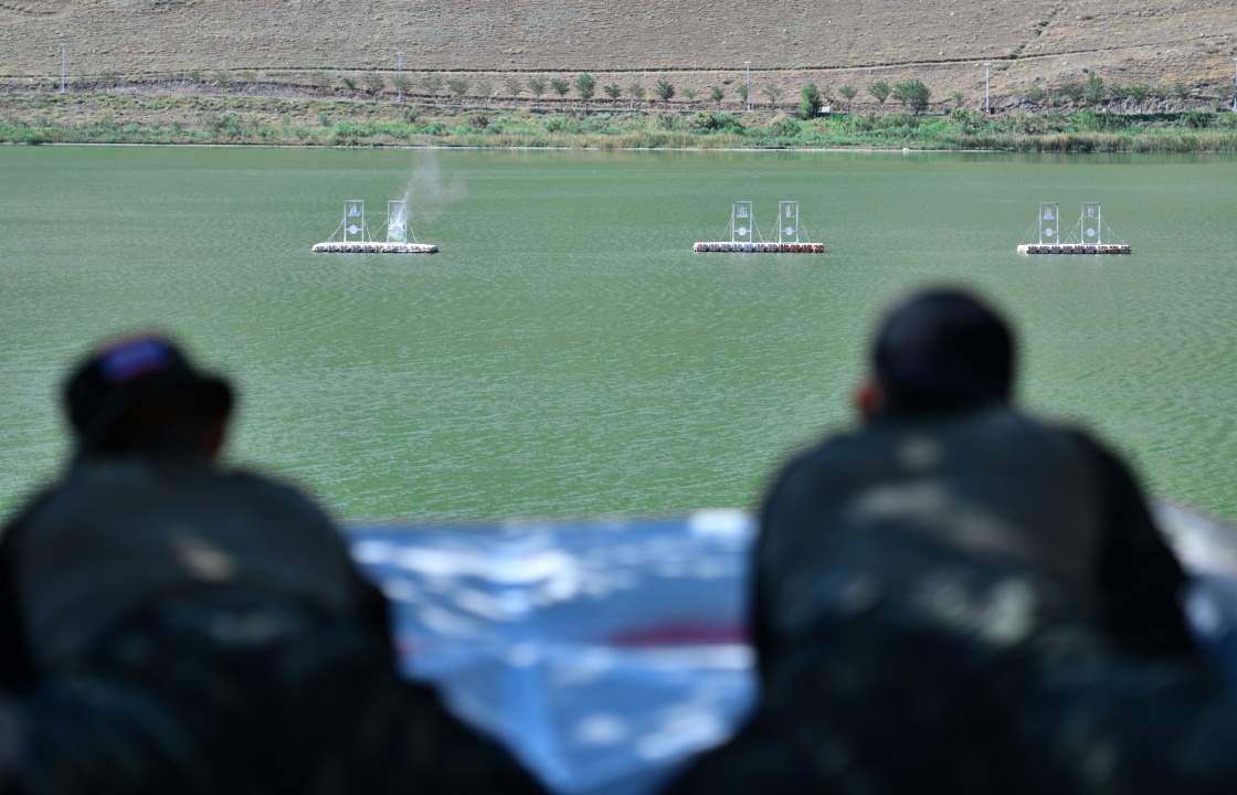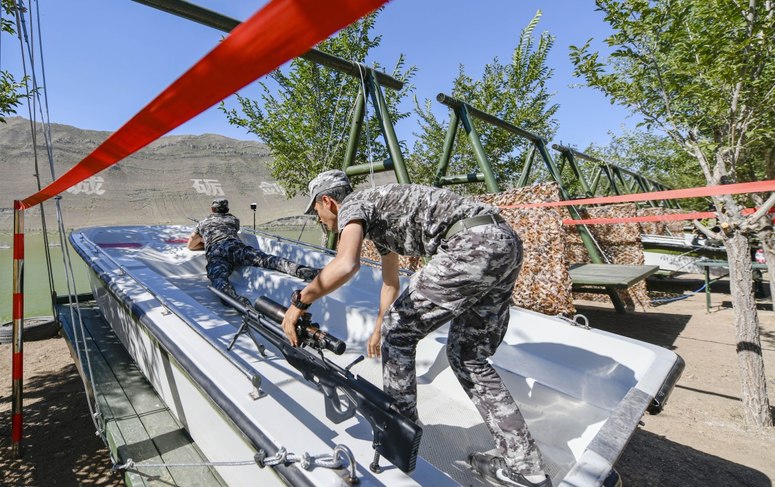 参加“锋刃-2023”国际狙击手射击竞赛的约旦参赛队员在水上狙击课目竞赛中(7月14日摄)。新华社发(侯崇慧摄)