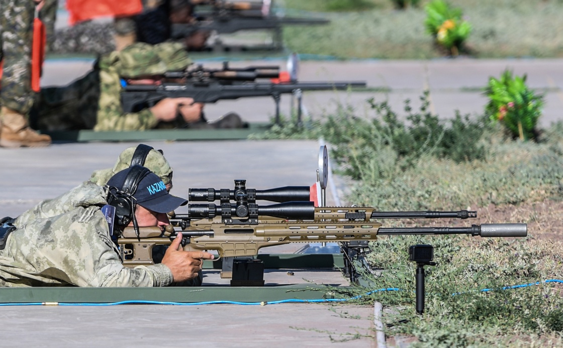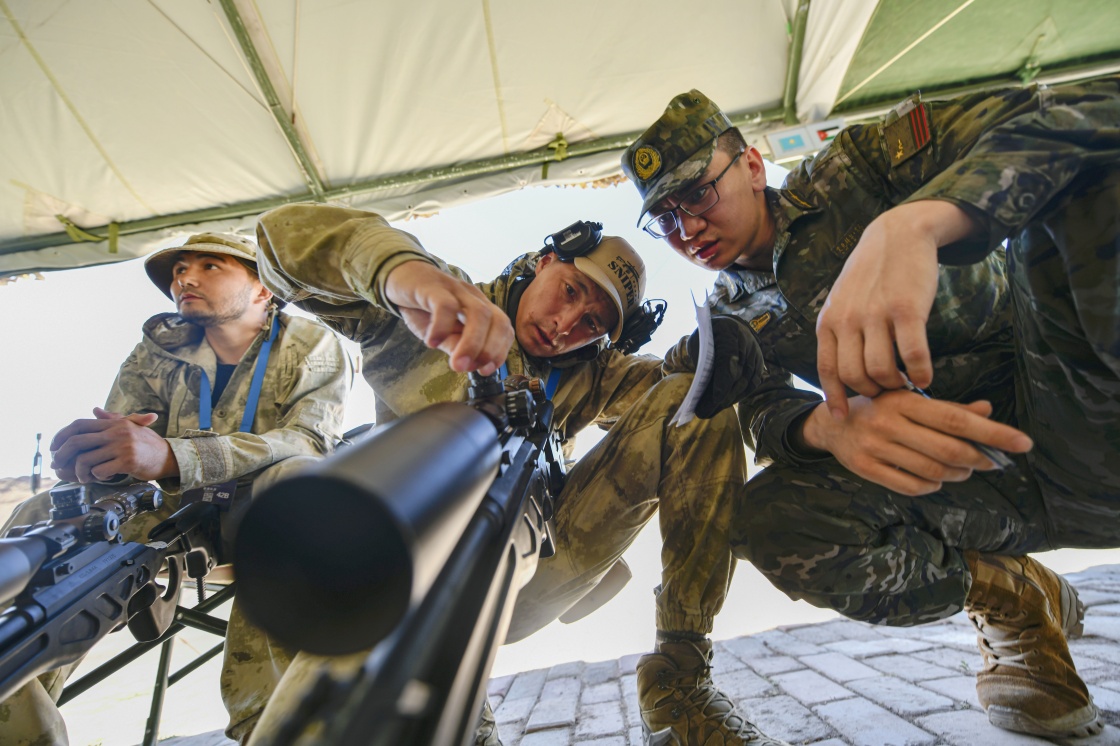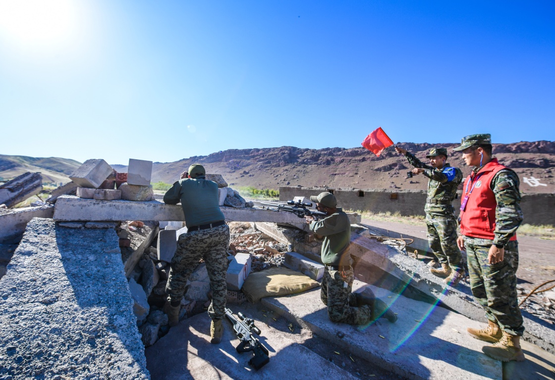 参加“锋刃-2023”国际狙击手射击竞赛的哈萨克斯坦参赛队员在运动目标狙击课目竞赛中(7月12日摄)。新华社发(安晓惠摄)