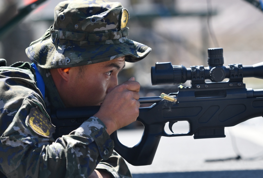 参加“锋刃-2023”国际狙击手射击竞赛的中国参赛队员在综合战斗狙击课目竞赛中(7月13日摄)。新华社发(徐伟摄)