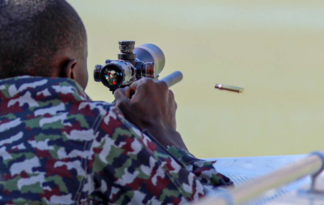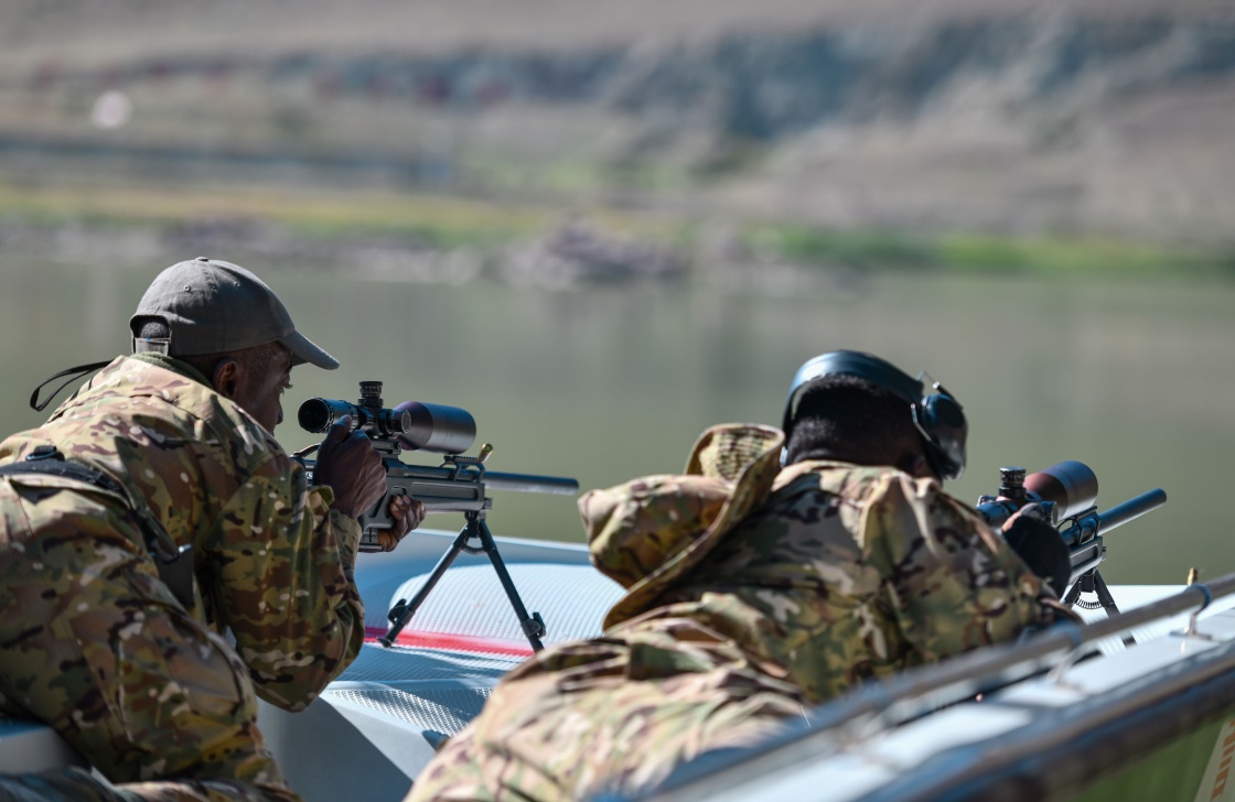 参加“锋刃-2023”国际狙击手射击竞赛的中非参赛队员在水上狙击课目竞赛中(7月14日摄)。新华社发(侯崇慧摄)