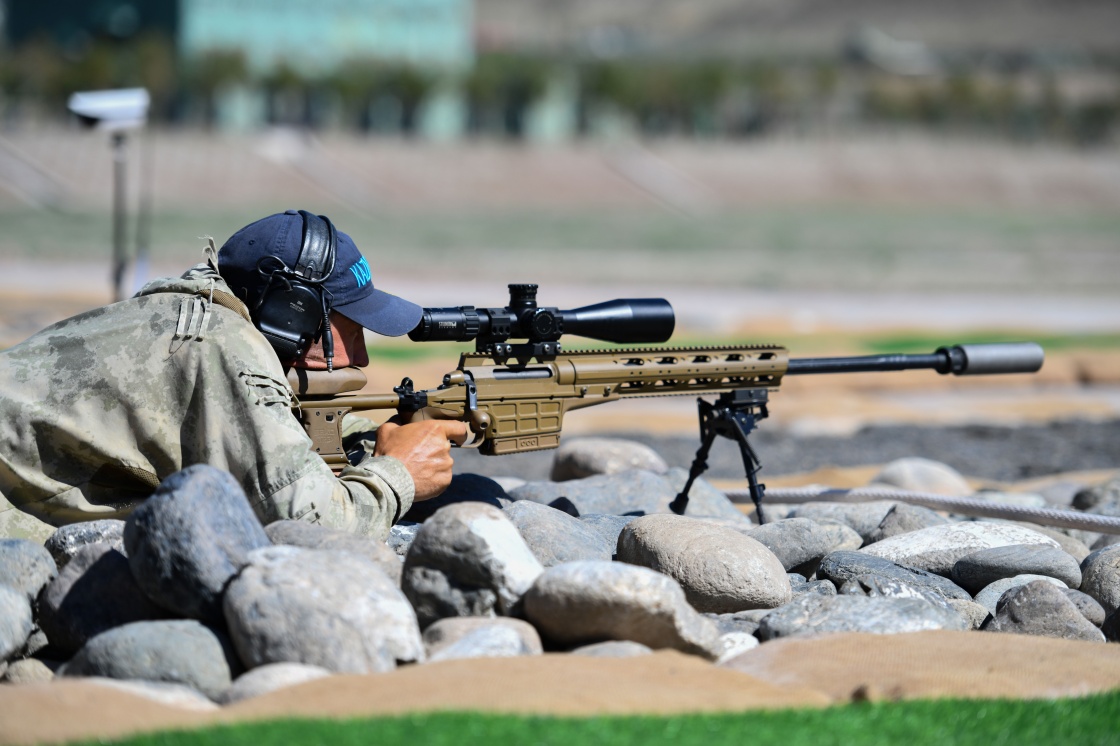参加“锋刃-2023”国际狙击手射击竞赛的科威特参赛队员在综合战斗狙击课目竞赛中(7月13日摄)。新华社发(安晓惠摄)
