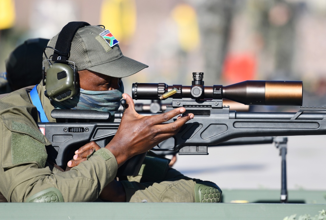 参加“锋刃-2023”国际狙击手射击竞赛的南非参赛队员在运动目标狙击课目竞赛中(7月12日摄)。新华社发(徐伟摄)