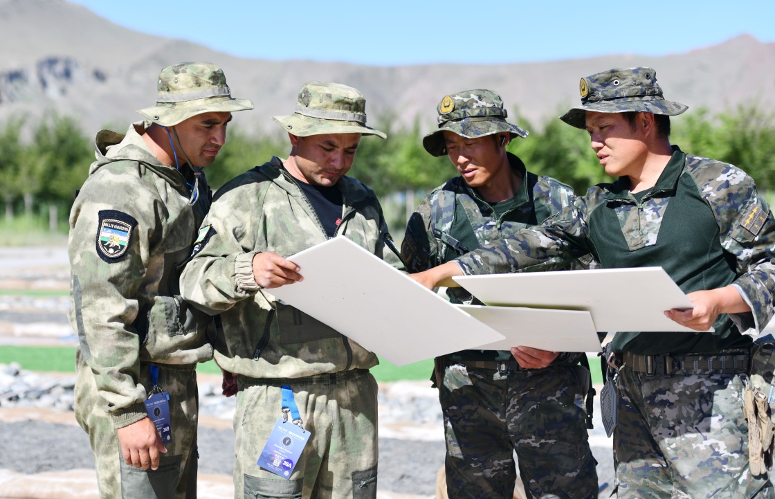 参加“锋刃-2023”国际狙击手射击竞赛的中国与乌兹别克斯坦参赛队员交流比赛经验(7月13日摄)。新华社发(徐伟摄)