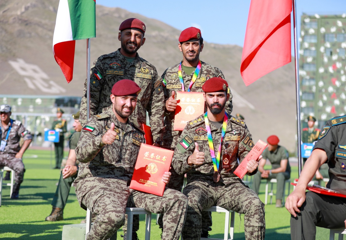 7月15日,“锋刃-2023”国际狙击手射击竞赛在乌鲁木齐武警某训练基地闭幕。这是科威特参赛队员在获奖后合影。新华社发(王忠伟摄)