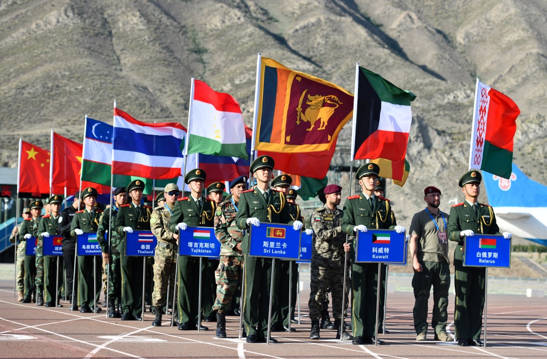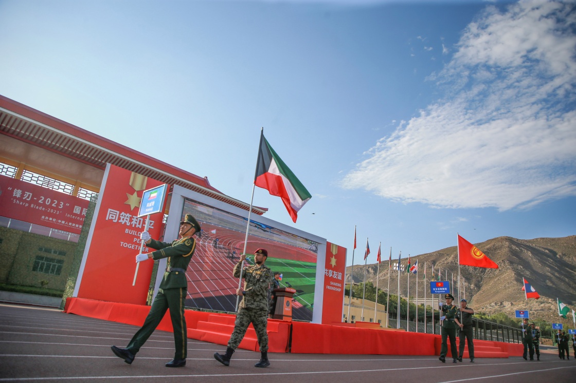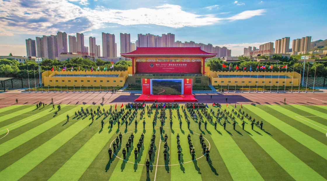 7月15日,“锋刃-2023”国际狙击手射击竞赛在乌鲁木齐武警某训练基地闭幕。这是各参赛国代表步入现场。新华社发(徐伟摄)