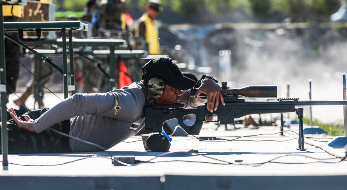 参加“锋刃-2023”国际狙击手射击竞赛的泰国参赛队员在单手狙击课目竞赛中(7月13日摄)。新华社发(安晓惠摄)