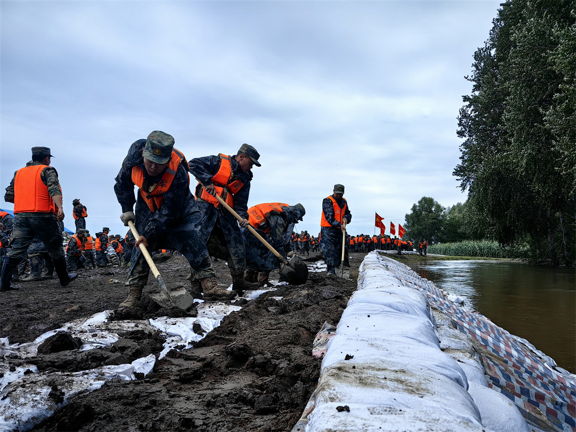8月5日,陆军第78集团军某旅官兵在黑龙江齐齐哈尔市碾子山区地域加固岸堤。新华社发(铁彦男 摄)