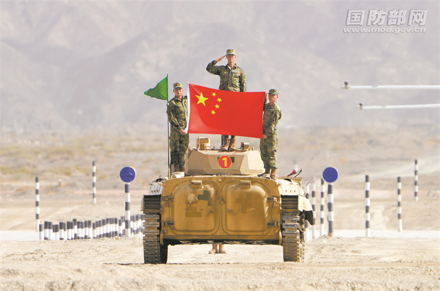 10时30分,中国参赛队和伊朗参赛队第一组出场。随着裁判长一声令下,悬挂绿色信号旗的中国车组率先驶出。中国车组迅速判定路线,通过机动越障路段后抵达射击阵位。装填弹药、搜索目标,随着炮弹破膛而出,靶标应声倒地。随后出场的其他国家参赛车组翻越土岭、崖壁,克服防坦克壕、雷场等障碍,高速通过涉水场,激起数米高的水花,赢得在场观众的热烈欢呼。