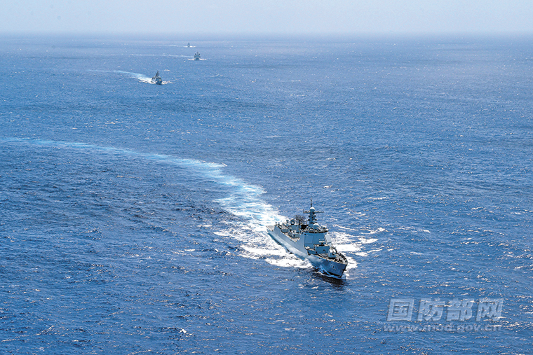中国、俄罗斯、南非三国联演海上实兵演练阶段,参演舰艇向目标海域机动。马玉彬摄