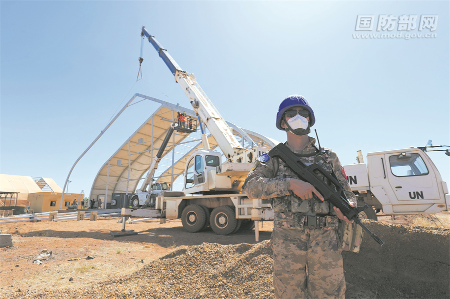维和官兵在施工现场进行吊装作业。葛学禹摄