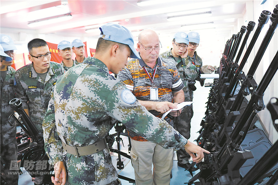 联南苏团官员在我维和步兵营进行装备核查。时成帅摄