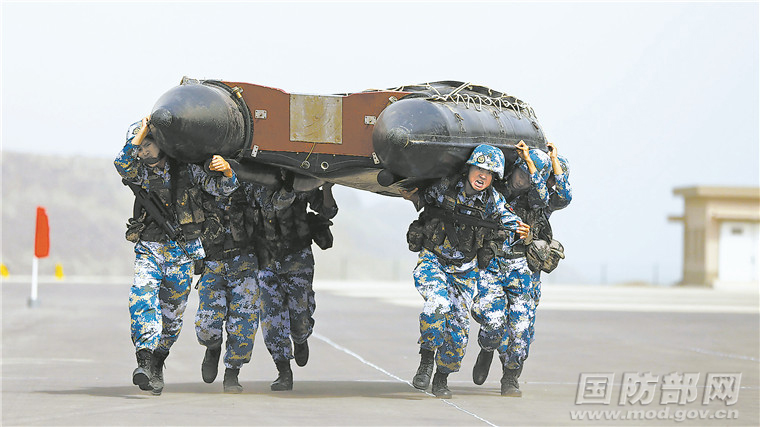 抬橡皮艇接力课目比拼中,官兵奋力冲刺。檀龙龙 摄