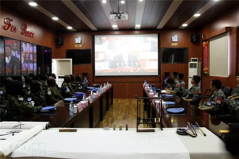 中非赴黎维和部队官兵观看习主席在中非合作论坛北京峰会上的讲话,第一时间了解掌握大会盛况。陈忠洪 摄