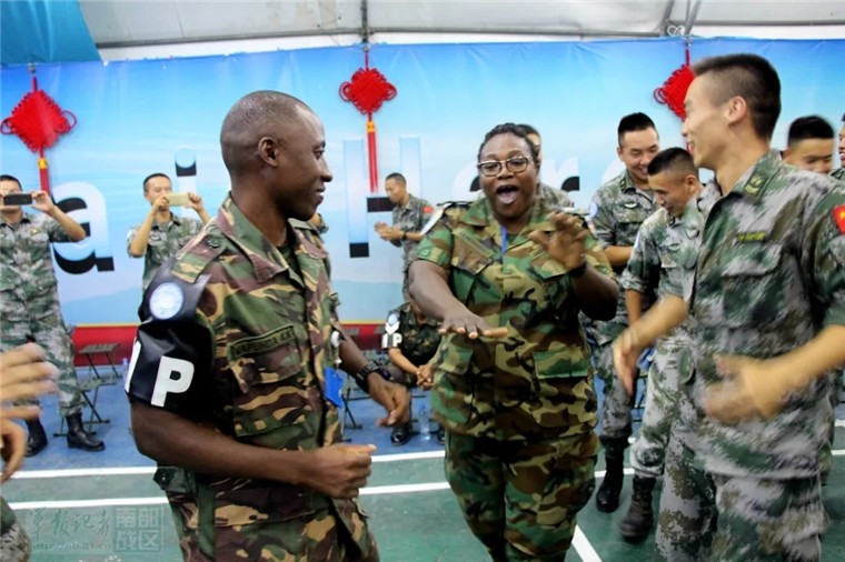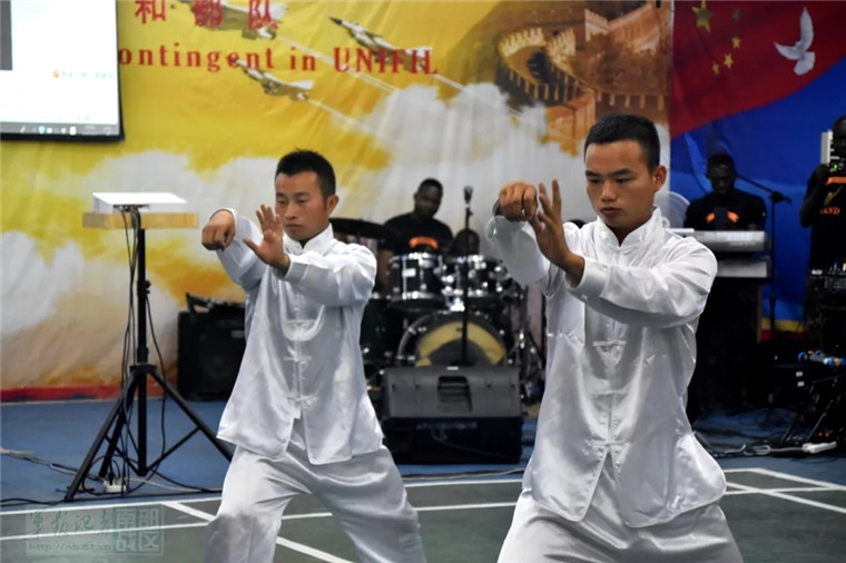 研讨结束后,中非维和官兵共同举办了一场文艺晚会,通过武术、器乐、歌唱、舞蹈等传统文艺表演互动,感受中非传统文化的魅力。加纳营BAND乐队带来了激情洋溢的现场表演,中国维和官兵在表演中还穿插了富有中国特色的武术、太极和民乐展示,让非洲友军领略到了中华传统文化的博大精深。双方官兵积极互动,现场气氛热烈,晚会最后,中非维和官兵载歌载舞共同演绎了一曲《友谊地久天长》,将氛围推向了高潮。