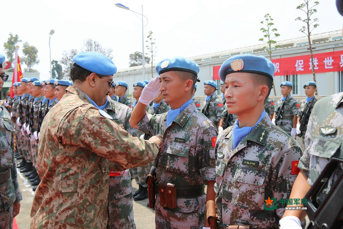 授勋仪式上,联合国驻刚果(金)稳定特派团司令埃利亚斯·马丁斯·费罗中将对中国工兵、医疗两支分队高度专业的工程及卫勤保障能力给予了高度赞誉,刚果(金)南基伍省省长克劳德·亚穆噶博·巴兹布维对中国维和部队为非洲人民作出的突出贡献给予充分肯定和感谢,嘉宾代表为官兵逐人授予“和平荣誉勋章”。随后,联稳团司令检阅了中国维和分队,4个方队迈着整齐的步伐依次通过外宾云集的观礼台,中国维和官兵威武的军姿、严整的军容赢得现场观众阵阵掌声。