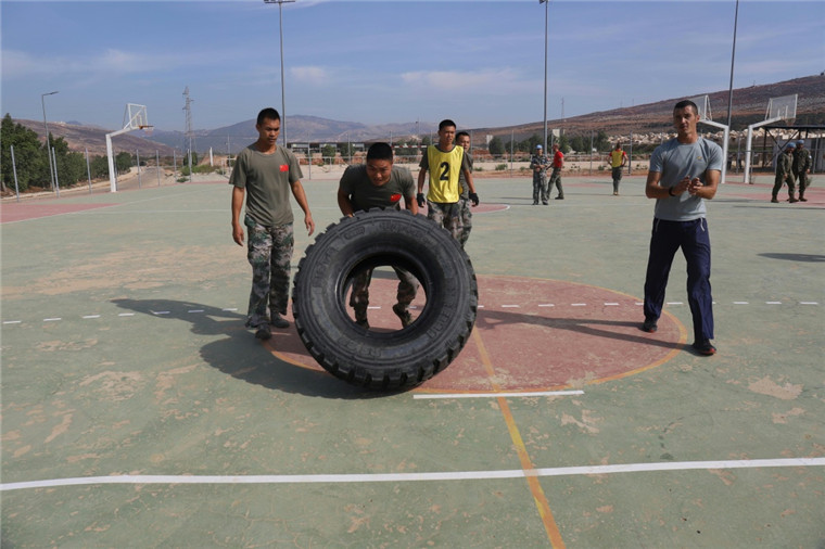 10月8日,在位于黎巴嫩南部的联合国驻黎巴嫩临时部队(联黎部队)东区司令部营区,中国参赛选手翻转轮胎。