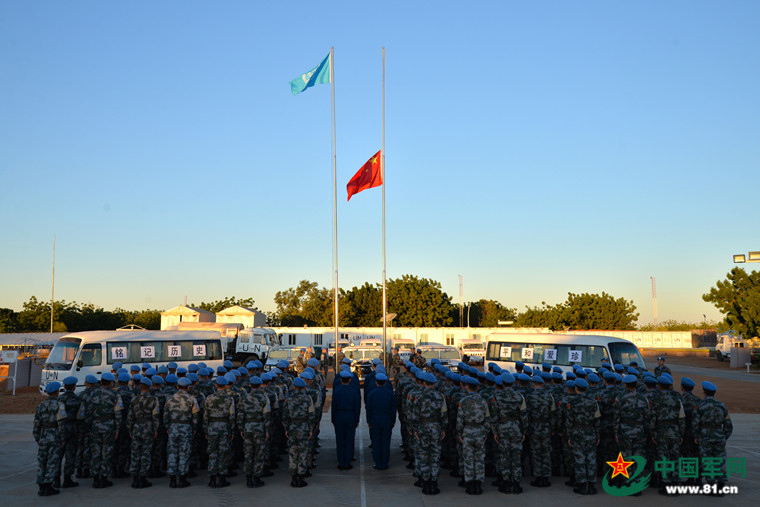 早晨6时30分,分队举行隆重的升旗仪式。伴着雄壮的国歌声,五星红旗和联合国旗冉冉升起。随后,国旗缓缓下降,下半旗致哀,营区上空随即响起防空警报,全体同志脱帽,颔首默哀。