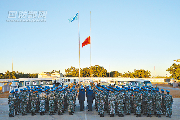当地时间12月13日,中国第2批赴苏丹达尔富尔维和直升机分队全体官兵在营区肃立,举行南京大屠杀死难者国家公祭日纪念活动,深切悼念大屠杀遇难同胞,教育引导官兵铭记历史、珍爱和平,用实际行动为维护世界和平贡献力量。费晓曦 摄
