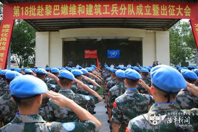 据悉,中国第十八批赴黎巴嫩维和部队建筑工兵分队19日在陆军第74集团军某旅举行成立暨出征大会。维和官兵头戴蓝色贝雷帽、身穿佩带中国国旗和UN臂章的迷彩服,踌躇满志、整装待发。