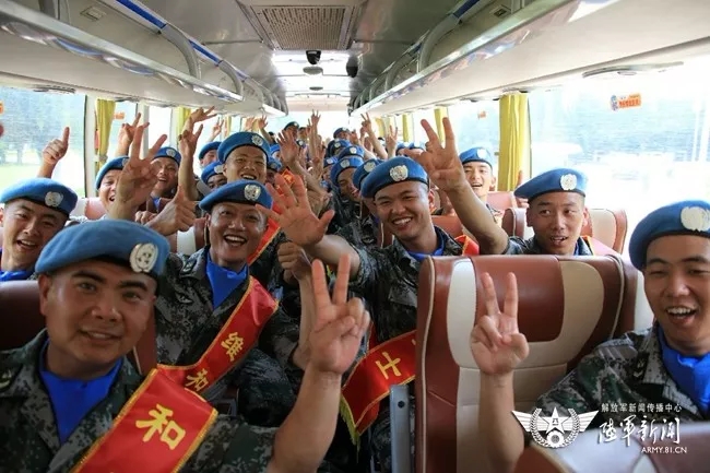 登上大巴,为国出征,维和官兵异常兴奋。