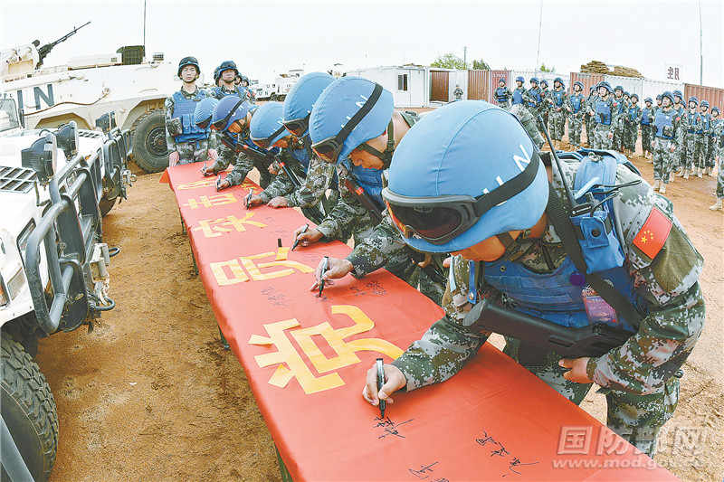 赴马里维和警卫分队党员突击队成员在横幅上签名。孙伯语摄