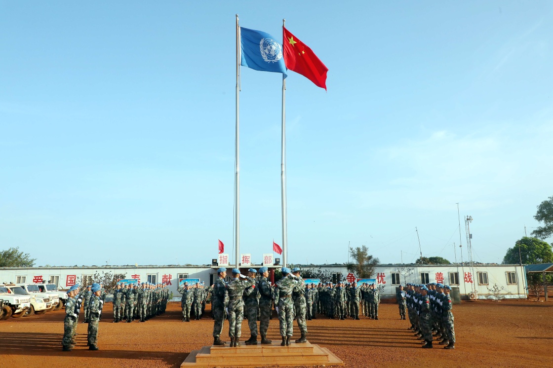 这是2019年5月1日,在南苏丹瓦乌,中国维和工兵举行升旗仪式。新华社发(贾方文 摄)