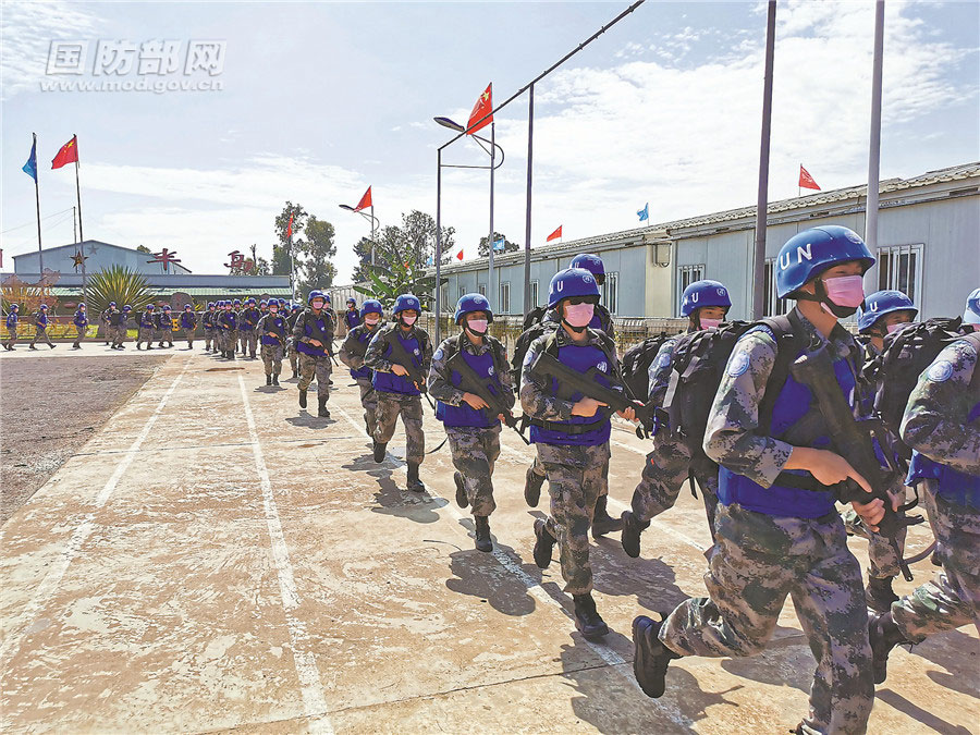 当地时间4月15日,中国第23批赴刚果(金)维和工兵分队组织紧急出动救援演练,增强官兵战备意识和处突能力。图为官兵紧急出动时的场景。王 玺摄