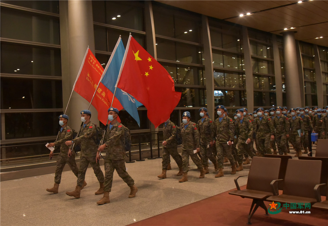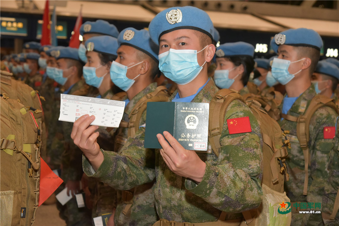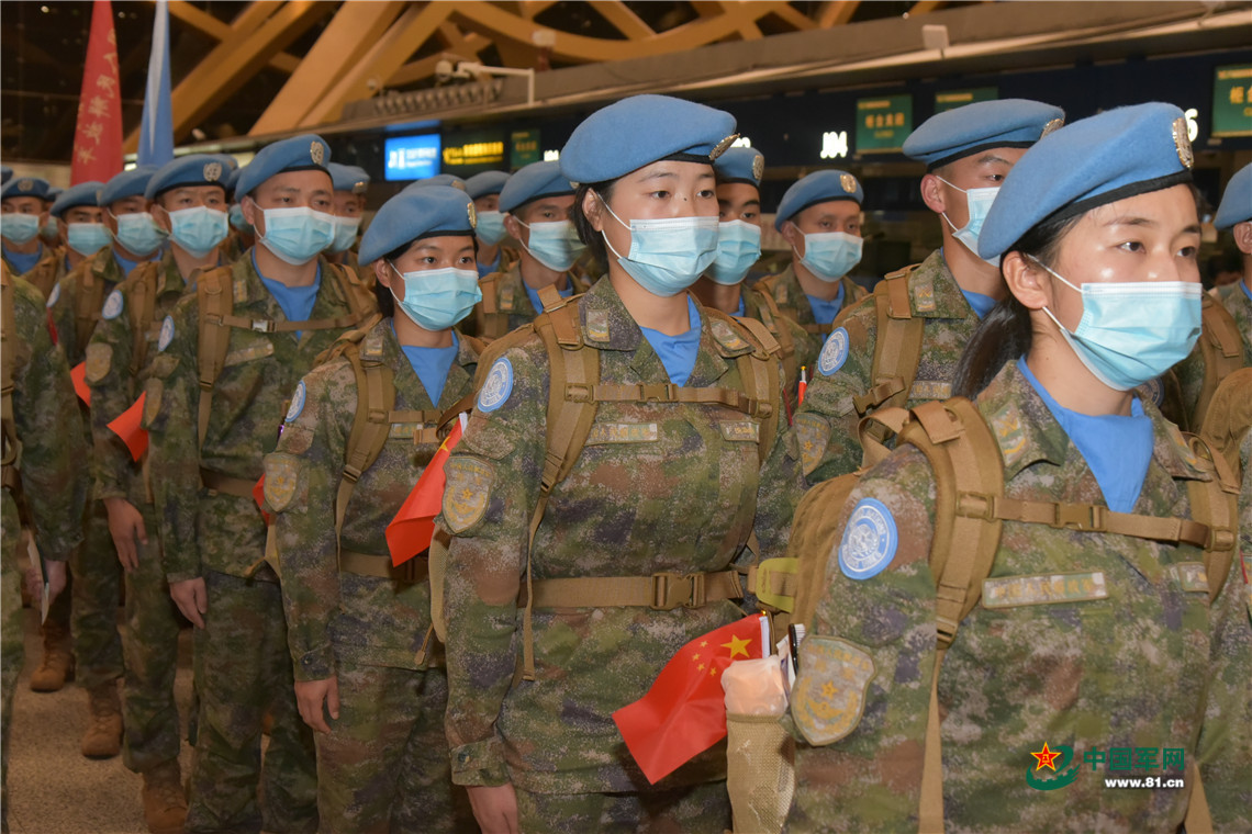 出征的维和官兵们头戴蓝色贝雷帽、身穿佩戴中国国旗和联合国臂章的“星空”迷彩服,以崭新面貌踏上维和的征程,亮相国际舞台。