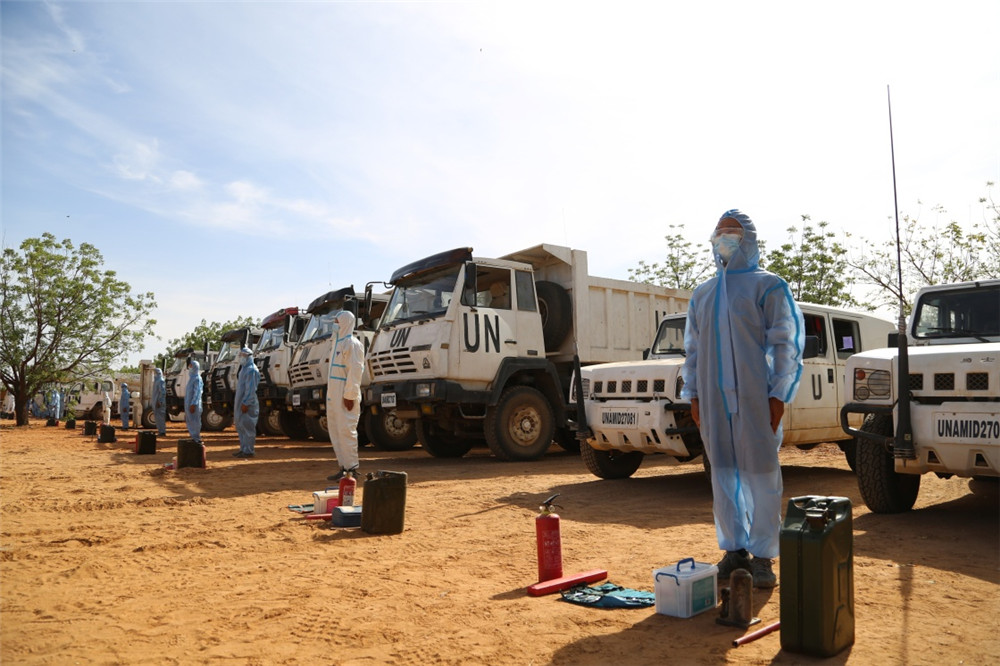 5月16日,在苏丹法希尔,中国第16批赴苏丹达尔富尔维和工兵分队官兵准备接受核查。新华社发(李晖摄)
