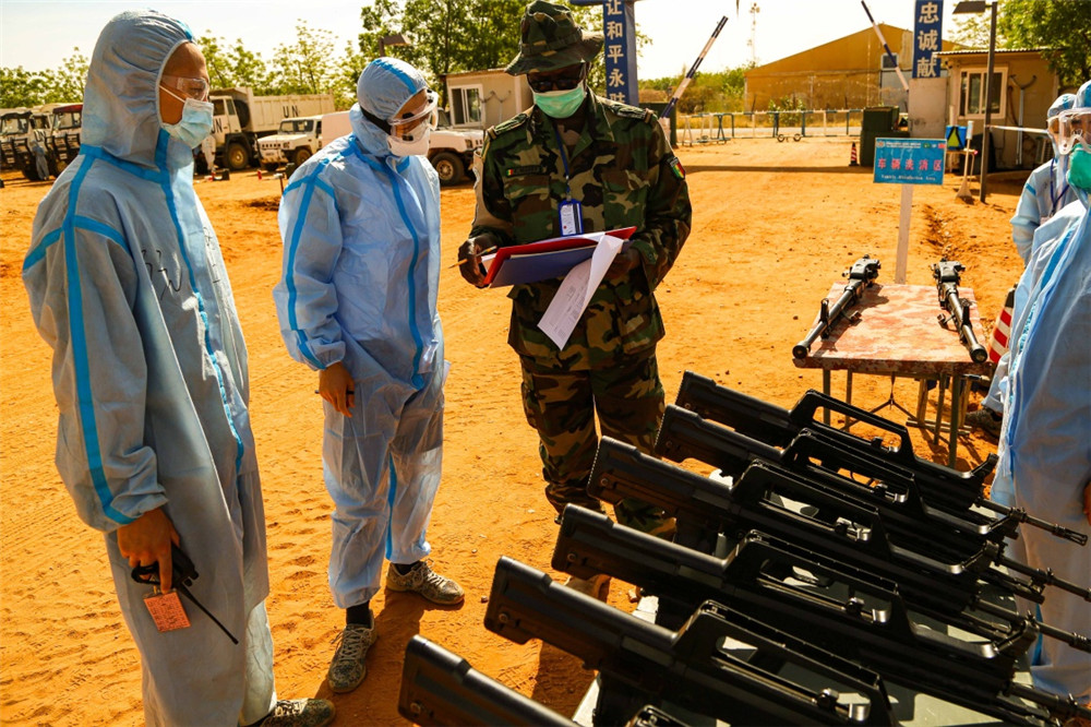 5月16日,在苏丹法希尔,核查组工作人员核查中国第16批赴苏丹达尔富尔维和工兵分队的枪支。新华社发(李晖摄)