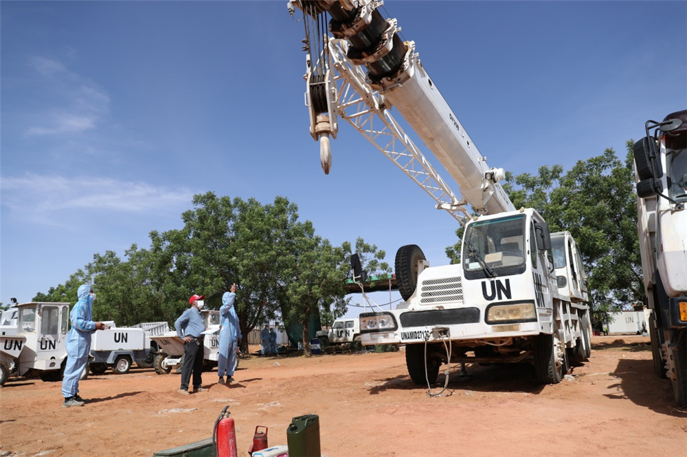 5月16日,在苏丹法希尔,核查组工作人员检查中国第16批赴苏丹达尔富尔维和工兵分队工程机械的性能。新华社发(万端武摄)