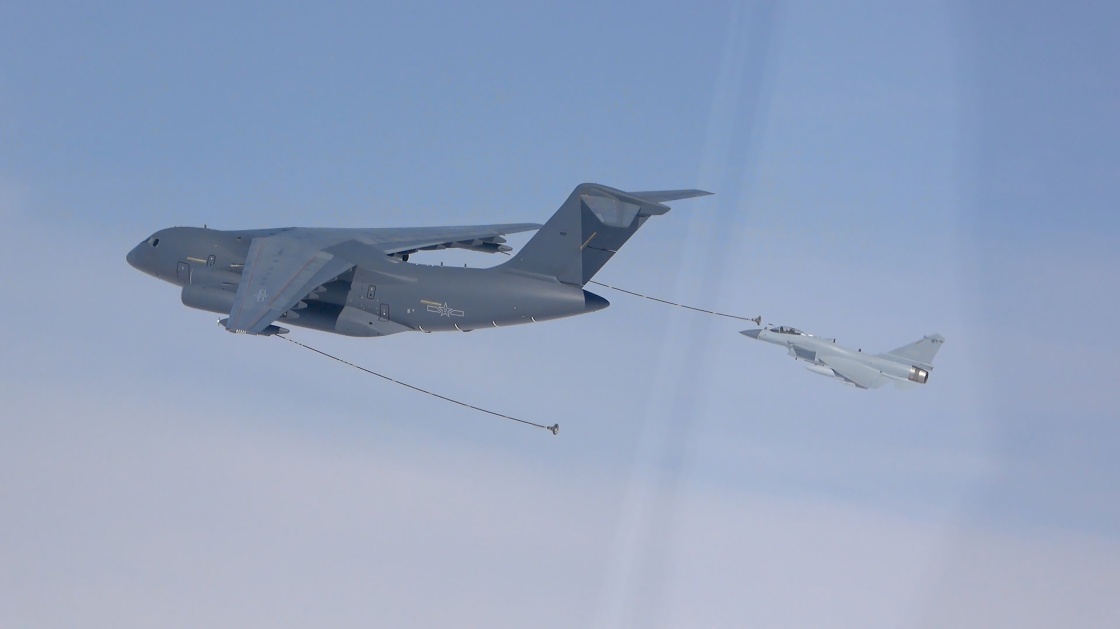 这是战机在进行空中加油(4月9日摄,视频截图)。新华社发
