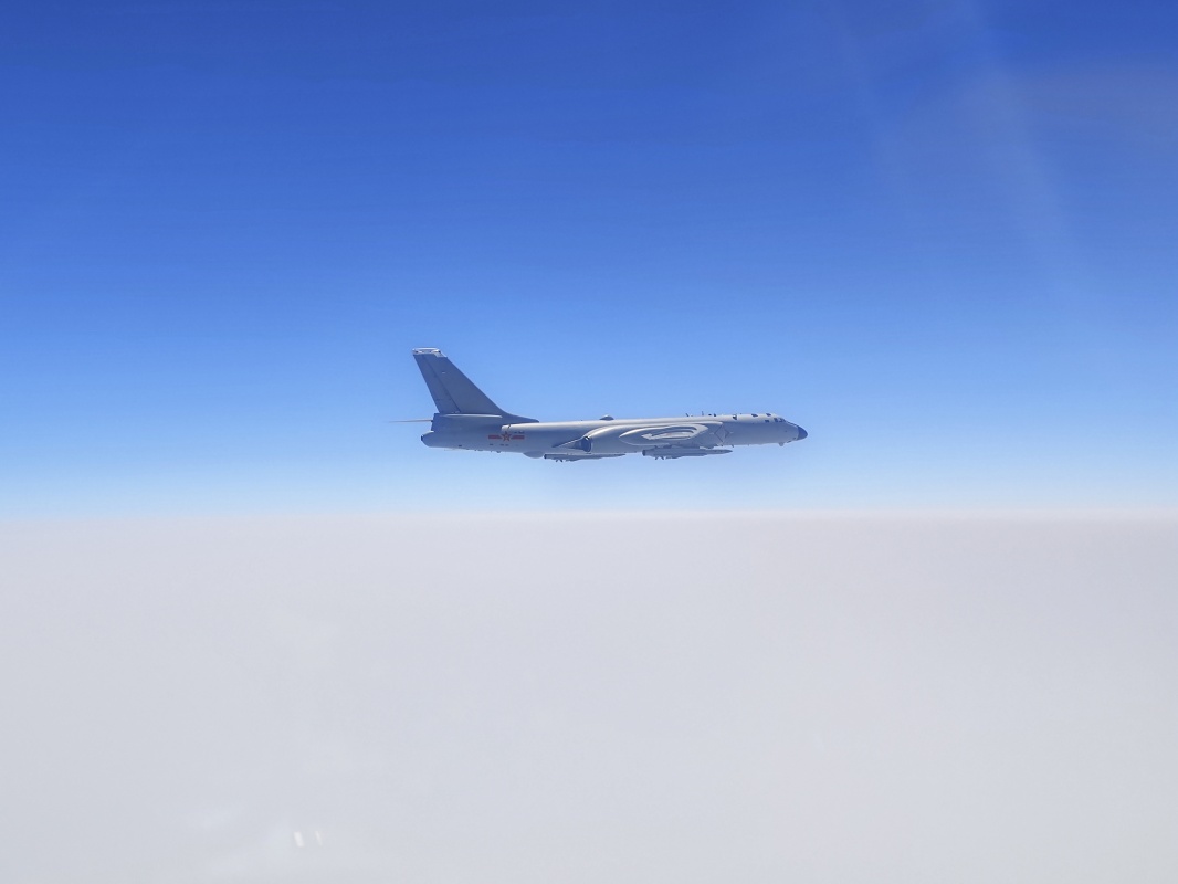战区空军多架轰-6K、轰-6M战机,在歼击机掩护下低空突防,协同远箱火、常规导弹,使用精确制导弹药模拟打击台岛关键目标。