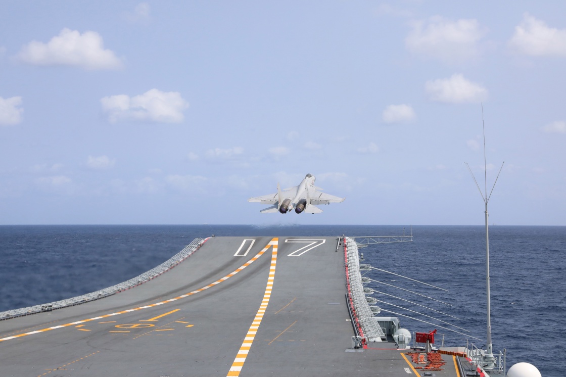 这是歼-15舰载机从海军山东舰起飞升空(4月9日摄)。新华社发(安妮 摄)