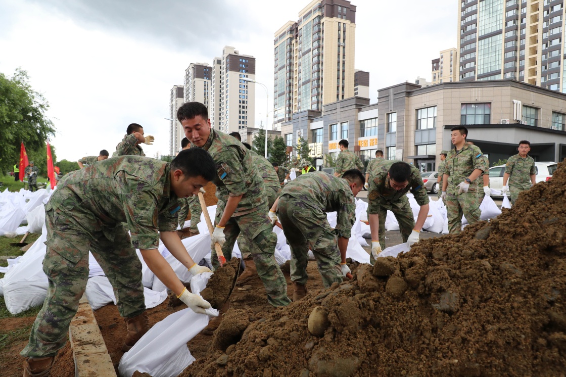 北部战区空军航空兵某旅组织官兵在黑龙江省牡丹江市东安区环江南街装填沙袋(8月5日摄)。新华社发(陈浩 摄)