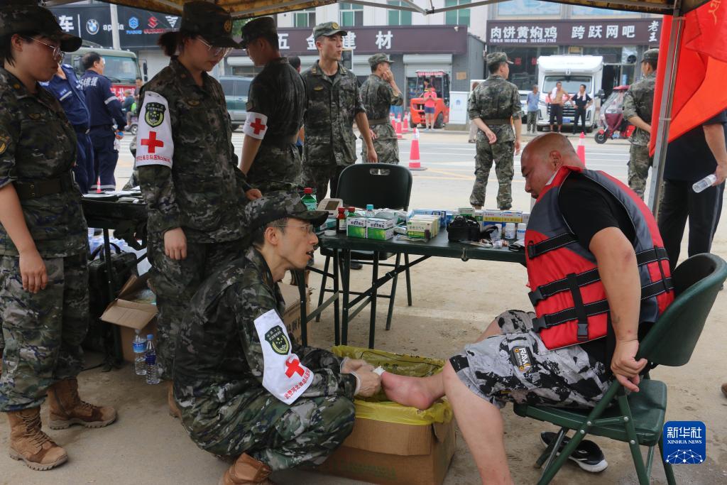 8月6日,在洪水退去后的河北省涿州市,武警河北总队医院派出的医疗救援队设置了便民医疗点位,当地群众纷纷前来寻医问诊。“白衣天使”们不辞辛劳,在提供医疗服务和基础药品的同时,展开防疫消杀和卫生宣传,竭尽全力守护着人民群众的生命健康。