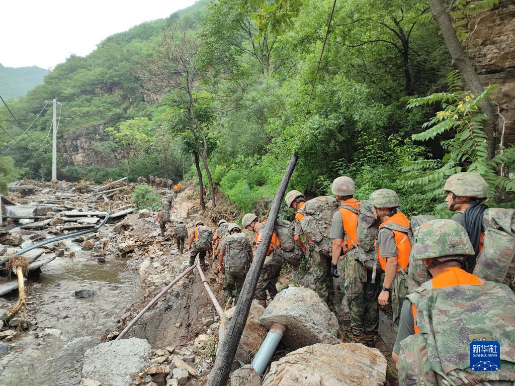 因山洪暴发,北京市门头沟区斋堂镇交通中断。武警北京总队机动第一支队应急救援队徒步15公里山路,人均负重25公斤,为12个村运送食品、医药、防疫、照明等基础物资,保障村民基本生活。