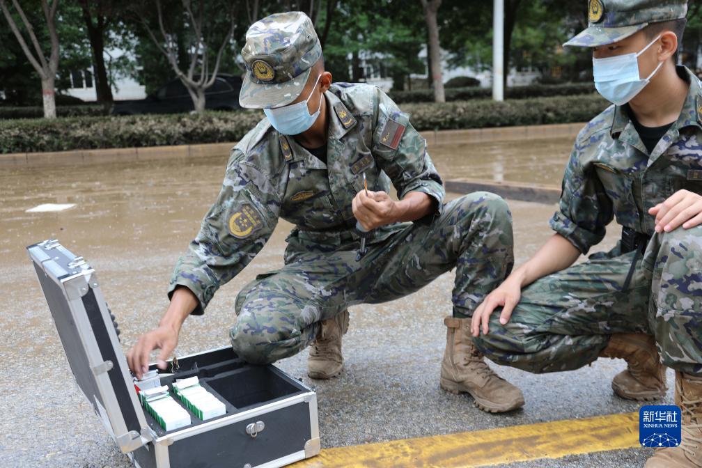 8月6日,武警河北总队机动支队官兵在河北涿州高新区腾飞大街勘测检查气体环境。新华社发(赵佳亮 摄)