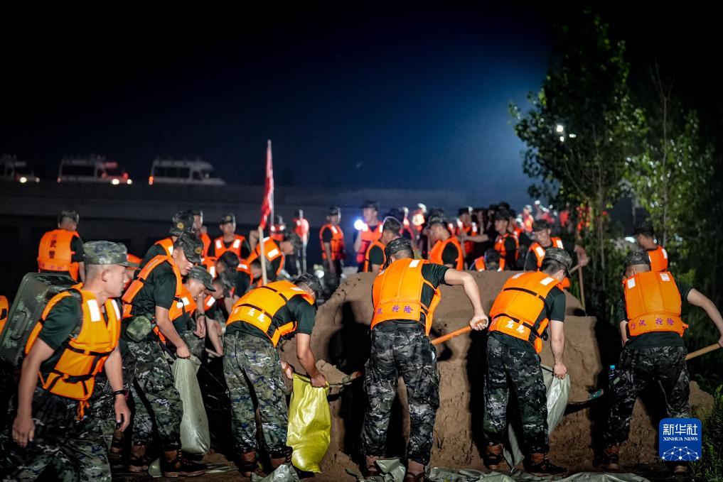 武警河北总队邢台支队官兵在河北邢台南澧河李召桥左岸大堤加固堤坝(7月31日摄)。新华社发(张羽 摄)