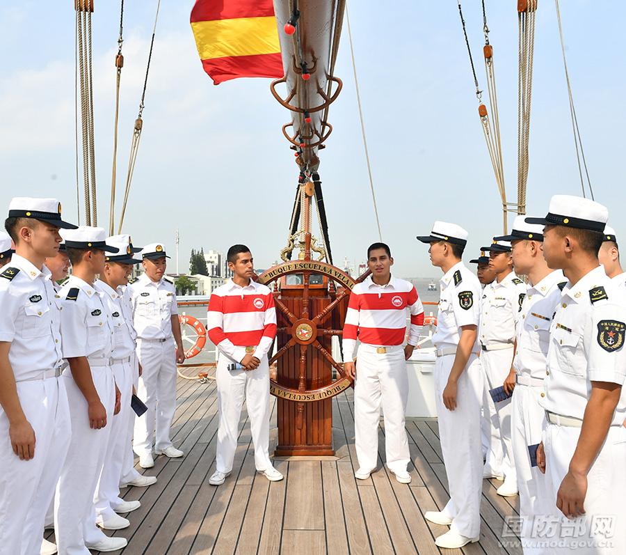 吴谦:9月18日至22日,秘鲁海军“联合”号风帆训练舰访问上海。期间,中秘两国海军官兵开展了专业技术交流、相互参观舰艇、文化体育比赛等活动。